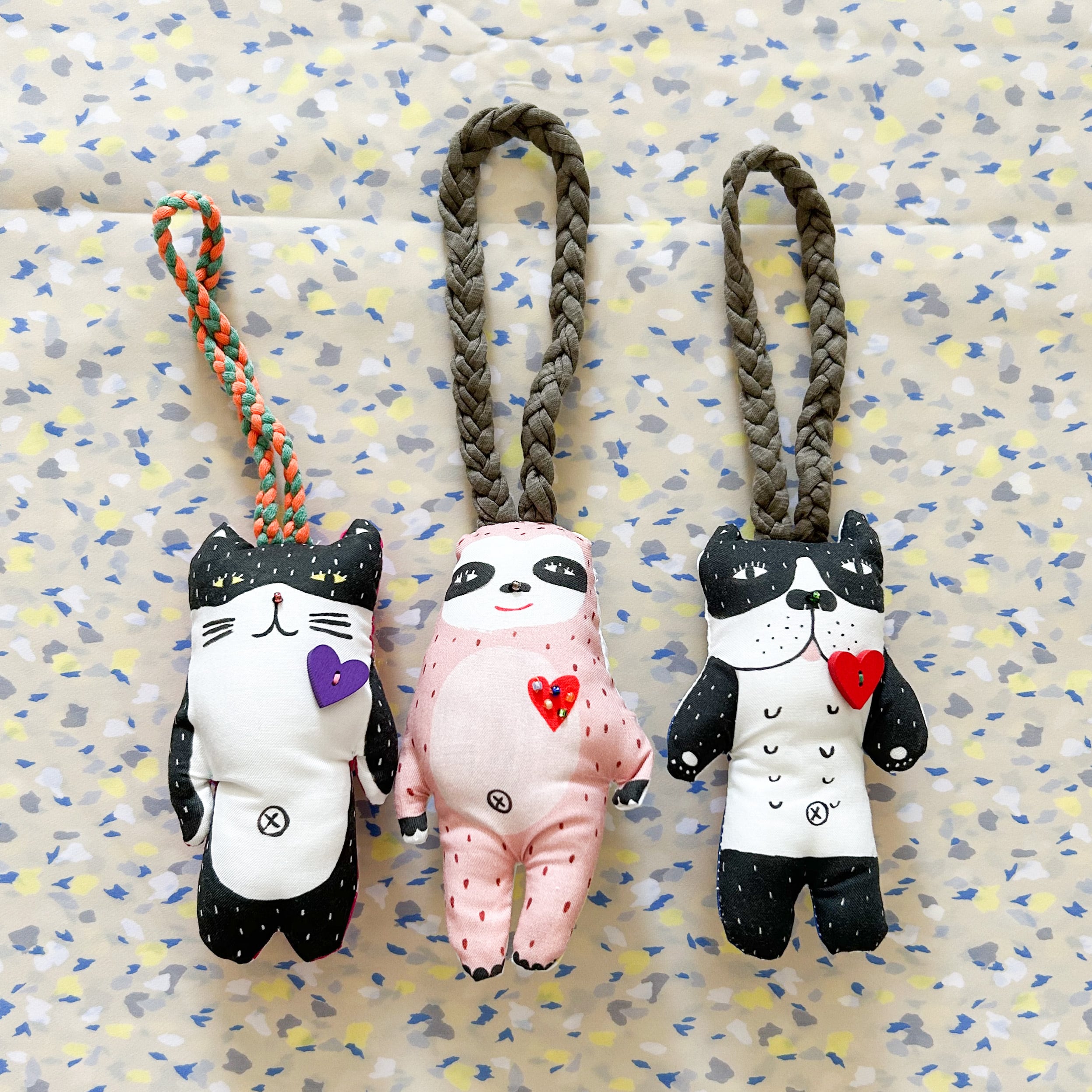 ハートのボタンとポンポンのしっぽが特徴で、持つだけで心が弾むようなデザインです。伸縮性のある紐でカバンなどにも簡単につけることができます。毎日の生活に楽しさをプラスしてくれますね!